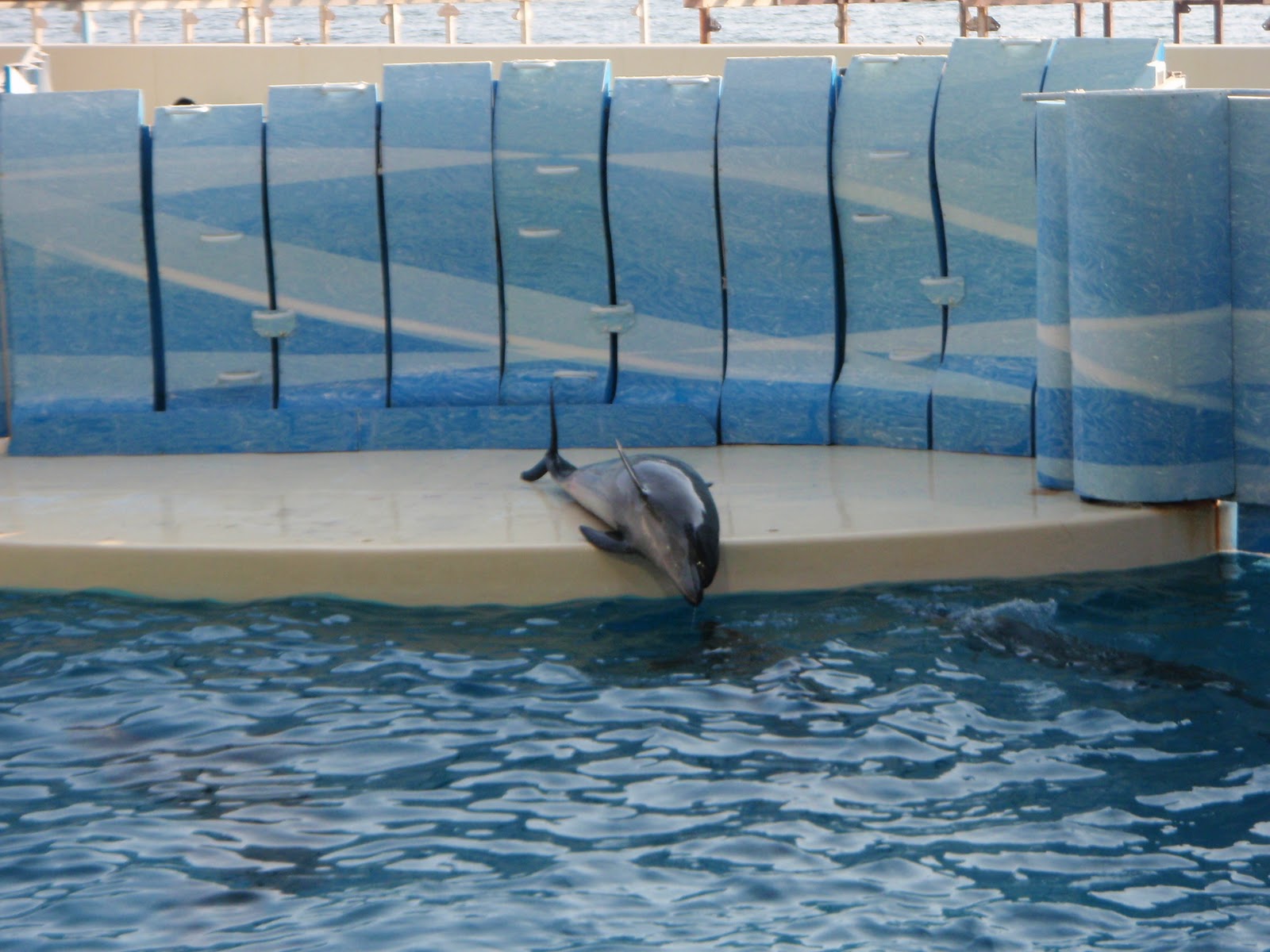 イルカショーが始まっちゃう!ってことで急いで会場に向かい、到着すると、狭いプールにイルカが4、5匹。